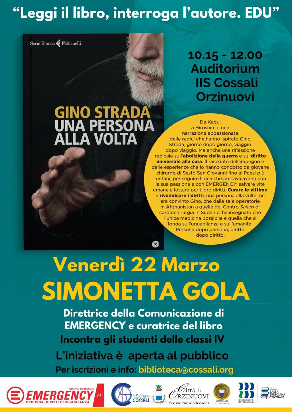 La Biblioteca dell’Istituto @iisgraziocossali ha organizzato l’incontro con la dott.ssa Simonetta Gola, direttrice della Comunicazione di Emergency e curatrice del libro del dott. Gino Strada, "Una persona alla volta", editore Feltrinelli. L’evento, nell’ambito del progetto “Leggi il libro, interroga l’autore.edu”, è rivolto in particolare agli studenti delle classi quarte che hanno aderito all’iniziativa. L’incontro è aperto anche alla cittadinanza, con 50 posti disponibili su prenotazione. Per iscrizioni e informazioni: Questo indirizzo email è protetto dagli spambots. È necessario abilitare JavaScript per vederlo. Un’occasione per incontrare la dott.ssa Gola e conoscere da vicino la storia di Emergency. Evento organizzato dalla commisssione biblioteca: @locatelliantonietta, @lucia_ferraresi, Francesco Uberti, Mattia con la preziosa collaborazione di @emergency_brescia @comunediorzinuovi #eventi #biblioteca #scuola #cossali #emergency #ginostrada #simonettagola #unapersonaallallavolta #libro #incontriconl’autore