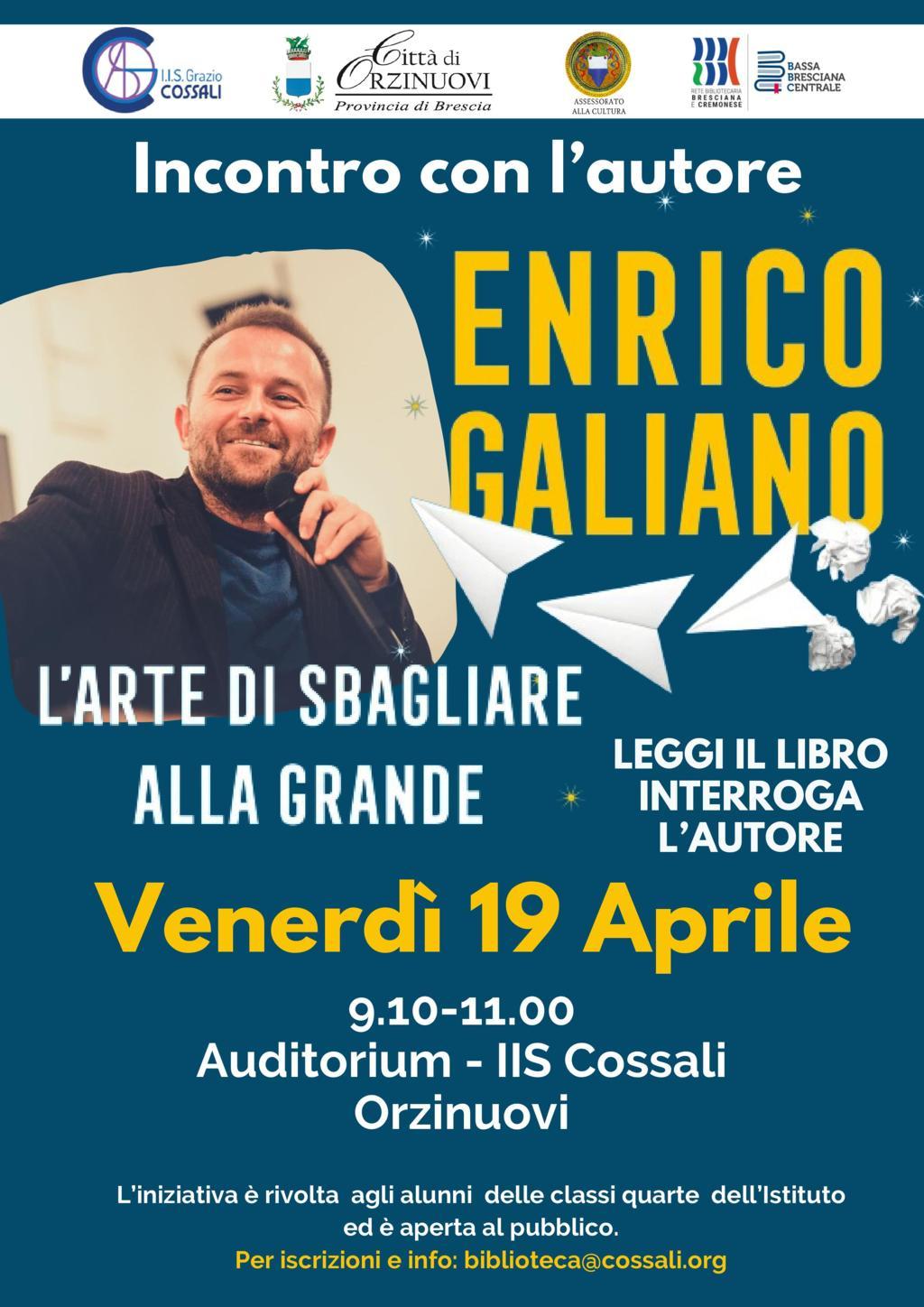 La Biblioteca d’Istituto, nell’ambito del progetto "Leggi il libro, interroga l’autore", ha organizzato l’incontro con Enrico Galiano, autore del libro dal titolo "L’ARTE DI SBAGLIARE ALLA GRANDE" edito da GARZANTI.